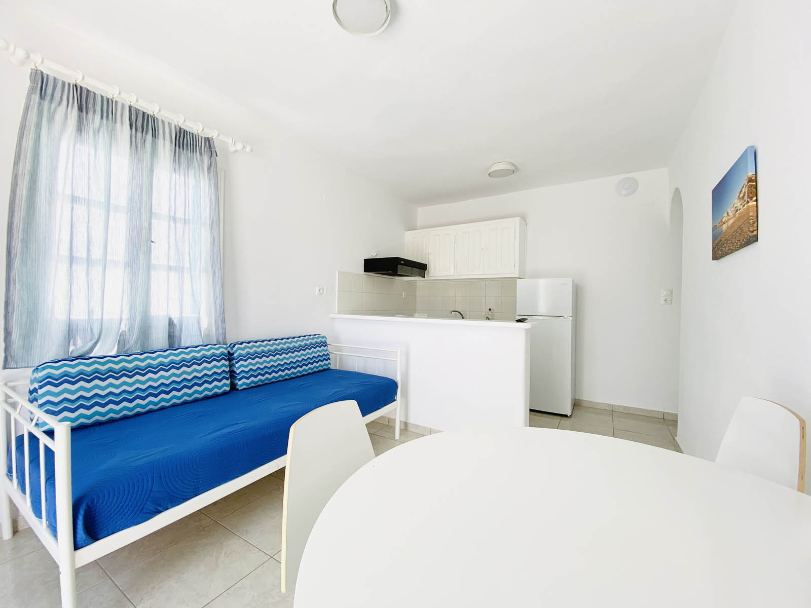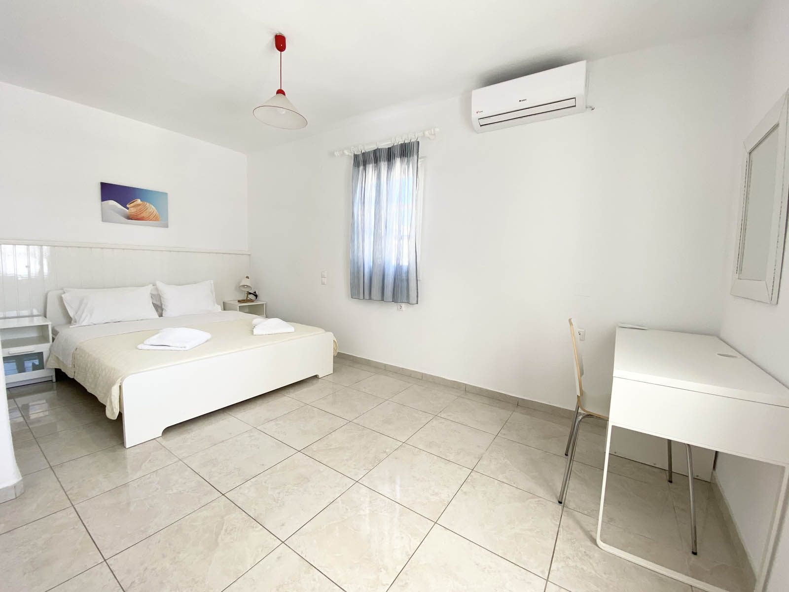 These spacious studios in Mykonos of Cyclades Studio Complex, is the ideal option for families who search for inexpensive family accommodation in Mykonos Island, Greece. The capacity of the studios is up to a family of 4 persons, providing a small kitchenette for the necessary family cooking. Furthermore, there is a big supermarket very nearby the studios, for the daily supplies needed for a family. These studios are also a smart choice for groups of friends up to 4 persons, that prefer to share an open studio for getting a great value for money rate for a budget accommodation in Mykonos Island, Greece. Cyclades Studios in Mykonos Island, offer wide range of studios from 1 to 4 persons suiting all needs, just a 2 minute walk away from Ornos Beach and the town center of Ornos Settlement.